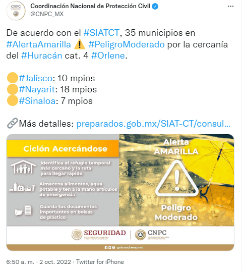 En su más reciente actualización, la Coordinadora Nacional de Protección Civil emitió alerta amarilla por el huracán "Orlene" en 35 municipios, 10 de ellos localizados en Jalisco.